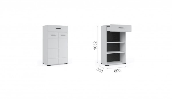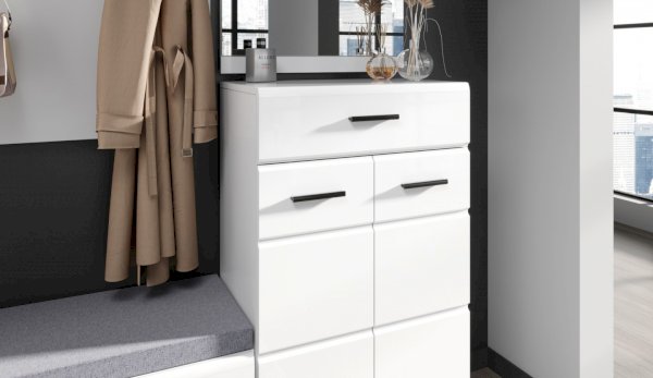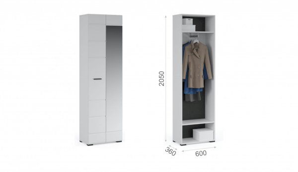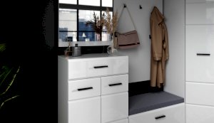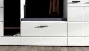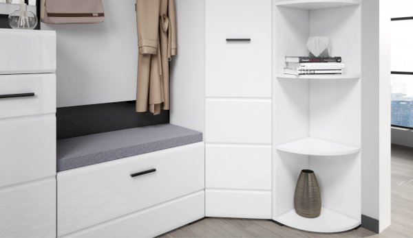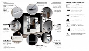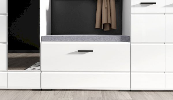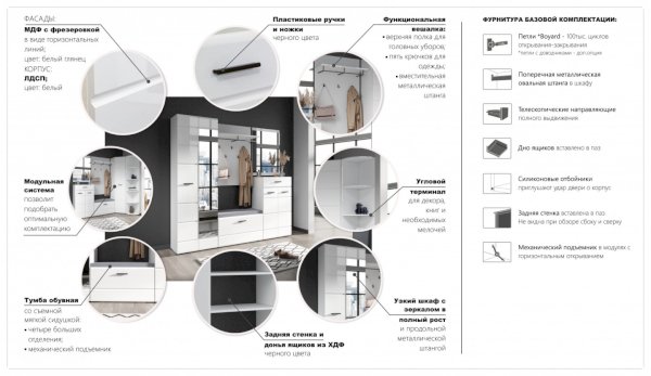 Прихожая Йорк выполнена в современном стиле – сочетает в себе функциональность и эффектный внешний вид: строгая горизонтальная фрезеровка фасадов, контрастные черного цвета ручки и задняя стенка из ХДФ. Глянцевые белые фасады High Gloss из МДФ и зеркала наполняют помещение светом, делают ее ярче и просторнее. Компактная и вместительная, с небольшой глубиной модулей, она поможет правильно организовать систему хранения даже в небольшом помещении.