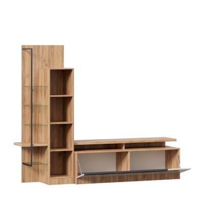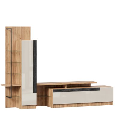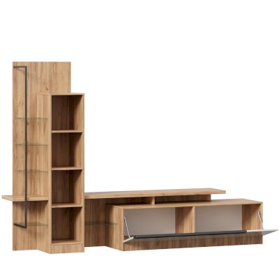 • Модуль скомбинирован из шкафа с открытыми и закрытыми полками, тумбы и полки под ТВ