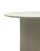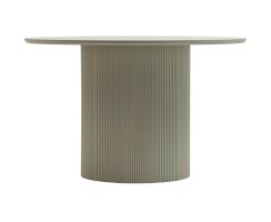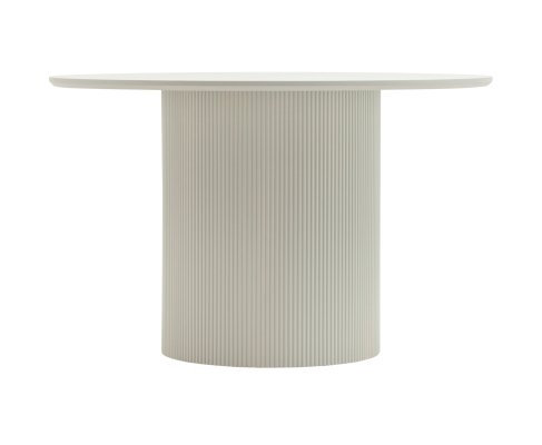Столешница выполнена из прочного и долговечного МДФ. Светлая поверхность столешницы гармонично сочетается с массивной основой серого цвета. Простая круглая форма стола позволит легко вписать его в современный интерьер, стол украсит кухню, гостиную или современное кафе, ресторан. Опорное плиссированное основание стола в лаконичном дизайне надёжно удерживает всю конструкцию и дополняет монолитный образ.