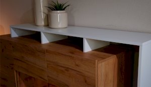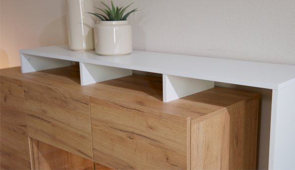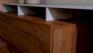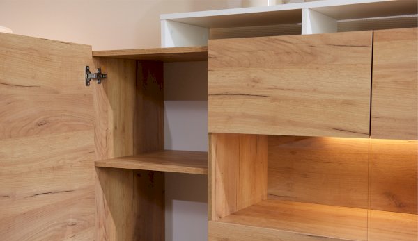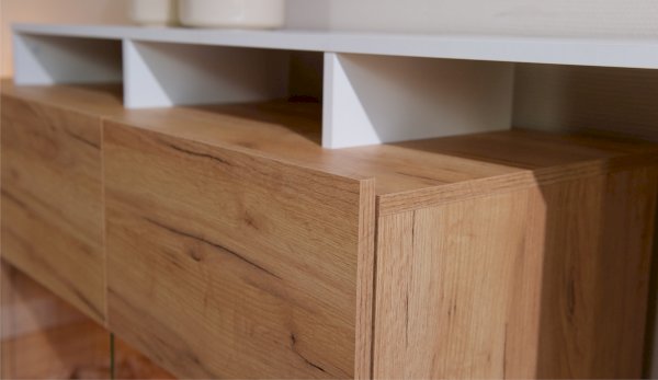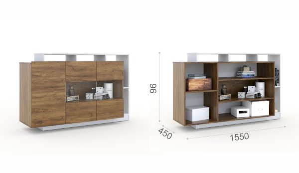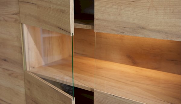 Красивый и практичный комод Невио - 2 обладает целым рядом преимуществ. Благодаря оригинальным открытым и закрытым полкам, отсутствию лицевой фурнитуры создает ощущение легкости и невесомости. Высота фасадов увеличена на 1 см для удобства открывания. С помощью витрины из прозрачного стекла Вы можете украсить свой дом милыми сердцу вещами и сделать на них акцент с помощью светодиодной подсветки. Задняя стенка витрины выполнена из ЛДСП в цвет корпуса, поэтому не будет отвлекать на себя внимание от наполнения витрины. Мебель выполнена из высококачественных экологичных материалов