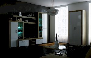 Гостиная «Орландо» опционально может комплектоваться светодиодной подсветкой стеклополок витрин. Фасадная часть гостиной подчёркнута стильными планками МДФ, представляющими собой элементы корпуса и фасада.
