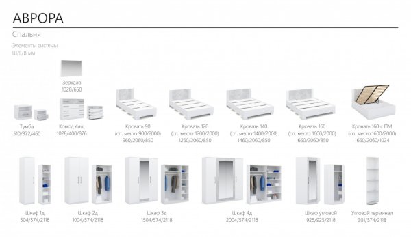 Аврора – это ХИТ продаж в Европе! Спальня выполнена в современном европейском стиле. Благодаря нейтральным оттенкам мебели, Вы сможете создать яркий и функциональный интерьер, отражающий ваши вкусы и предпочтения. 5 вариантов шкафов с вместительными полками и качественной фурнитурой позволяют создать полноценную систему для хранения. При создании спальни Аврора реализованы в полной мере «зеленые» принципы, которые напрямую влияют на экологичность мебели и соответственно на качество сна и наше здоровье. Система выполнена из высококачественных материалов.