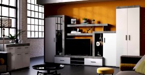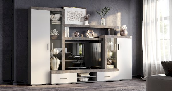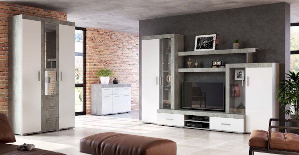 Гостиная Инстайл является частью одноименной модульной коллекции, все предметы которой идеально сочетаются между собой. Цвет бетон корпуса в комбинации с белыми матовыми фасадами и вставками из стекла придают гостиной Интсайл легкости. Два распашных шкафа, в один из которого встроена хромированная штанга, позволят разместить личные вещи и предметы гардероба. На нескольких открытых полках вы сможете хранить сувениры, фотографии или предметы декора.