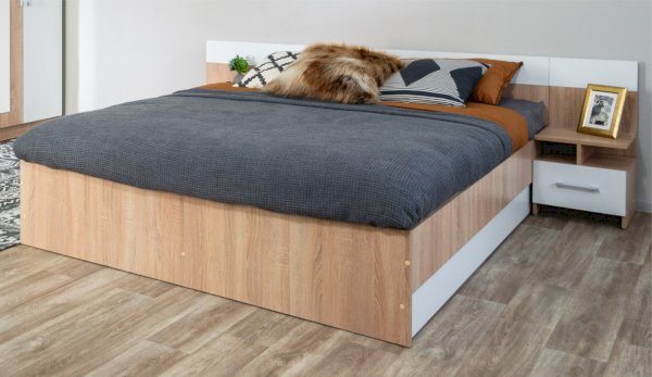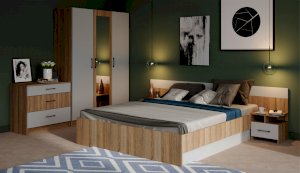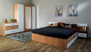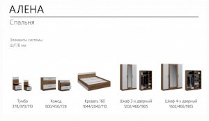 Спальня Алена выполнена в стиле минимализм - естественные цвета, текстура дерева, простота и функциональность. В комплекте Алена оптимальный набор функциональных модулей, который необходим для обустройства спальни: вместительный шкаф с полками и штангой, комод с ящиками, кровать с крепким и надежным основанием из ламинированной плиты и прикроватные тумбы. Кровать с двух сторон идеально дополняют идентичные по стилю прикроватные тумбы с высокой стенкой на одном уровне с изголовьем кровати - это создает визуальную целостность, добавляет ощущение защищенности.