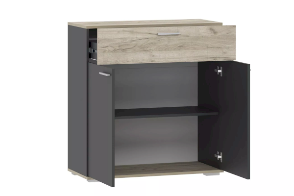 Тумба представлена в двух цветах на выбор – Антрацит/Дуб Крафт Серый и Белый Фасадный/Дуб Крафт Золотой. Они отлично комбинируются между собой, дают отдых глазам. Подобное оформление поможет совместить функциональность и красоту помещения и сделать даже небольшую комнату уютным местом для приема гостей и хранения вещей.