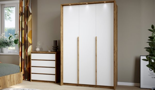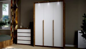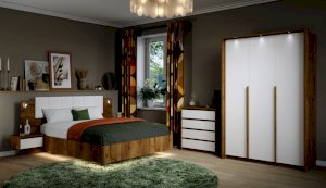 Мишель – это современная спальня с лаконичными формами и строгой геометрией в актуальных природных цветах. Оригинальная конструкция основания в сочетании со светодиодной подсветкой создают «эффект парения». Накладные светильники в комбинированном изголовье дают дополнительное освещение в ночное время, а мягкая накладка с вертикальной отстрочкой поддержит спину во время отдыха. Отсутствие лицевой фурнитуры в ящиках и комодах подчеркивают минималистичный дизайн спальни, а контрастные ручки шкафов оттеняют белизну фасадов.