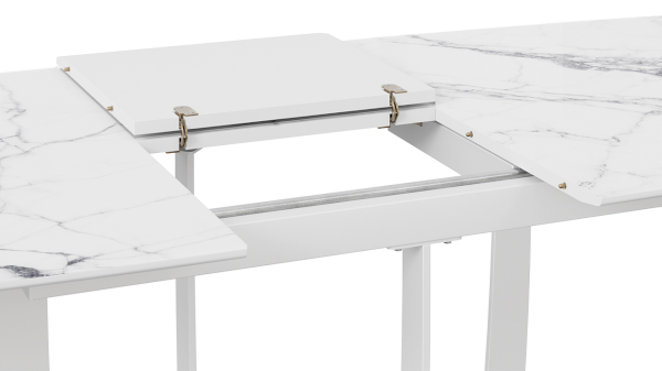 Разнообразие актуальных цветовых исполнений позволяет приобрести модель исходя из индивидуальных предпочтений каждого потребителя, подобрав мебель на любой вкус и цвет. Новинка представлена в декорах с глянцевой белой и черной столешницей, с рисунком «под мрамор», которые воплощают роскошь современных модных тенденций, а столешница со стеклом «оникс» выражает благородство и безупречность. Вставка изготовлена со стеклом, на которой продолжается рисунок декора, что позволяет столу не терять эстетической окраски даже в разложенном варианте, делая образ изделия целостным и завершенным.