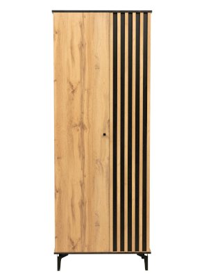 Дверцы шкафа разной ширины. Однотонное полотно гораздо шире, дверца с фасадной рейкой уже – она является основным акцентом и сразу обращает на себя внимание.
