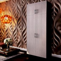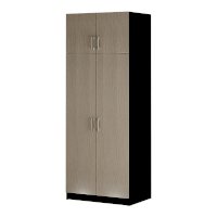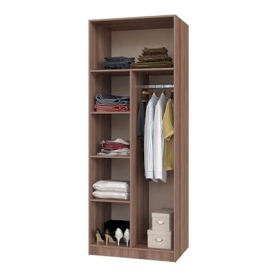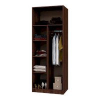 Функциональный двухстворчатый шкаф справится с размещением большого количества предметов одежды и аксессуаров. Модель разделена на две зоны, каждая из которых оснащена распашными дверцами. В большей части находятся полки и отделение с хромированной штангой. Часть поменьше представляет собой вместительную нишу для хранения. Изделие выполнено из ЛДСП.