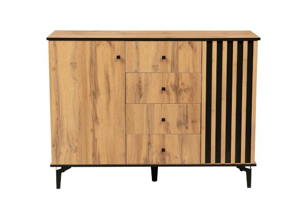 По краям – справа и слева – за распашными дверцами находятся полки, а в середине – четыре выдвижных ящика. Однако в середине – это не значит, что в центре. Принцип асимметрии здесь ярко выражен. Левая часть комода самая широкая, правая – гораздо уже. А пространство между ними отдано под выдвижные ящики. Таким образом, самая вместительная часть комода находится слева, за однотонной распашной дверцей цвета дуба Вотан. Внутри – два отделения – больших и вместительных, сюда поместятся объемные вещи. Каждая полка из ЛДСП выдерживает до 5 кг. В правой стороне места чуть поменьше – за счет ширины полок, но вполне достаточно, чтобы разместить, например, коробки с обувью или сложить вещи или постельное белье. Выдвижные ящики предназначены для хранения менее габаритных вещей. В зависимости от тематики помещения в них можно разложить бумаги, документы, нижнее белье, полотенца. На верх комода можно поставить телевизор, а если повесить над ним зеркало и на столешнице расставить духи и косметику, он превратится в туалетный столик!