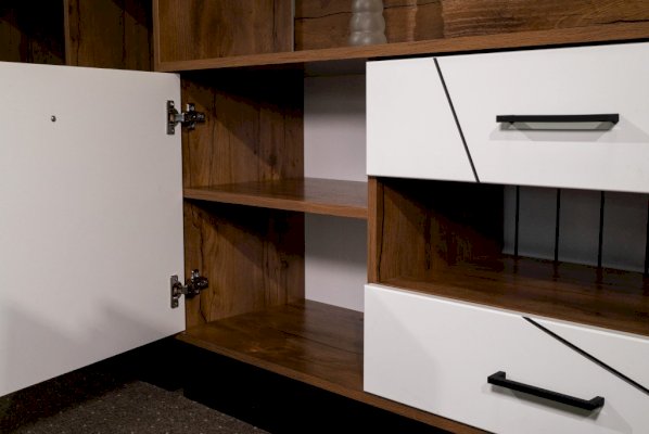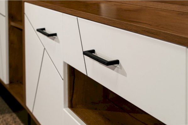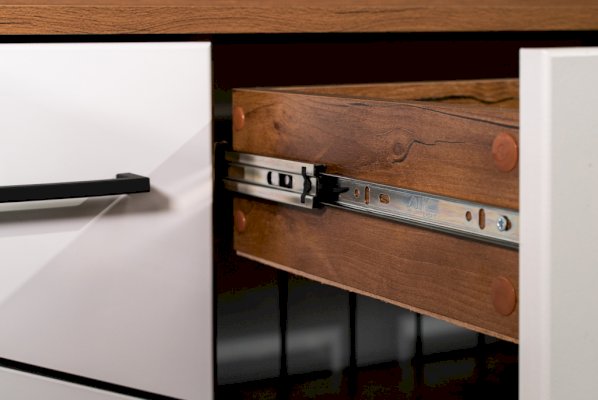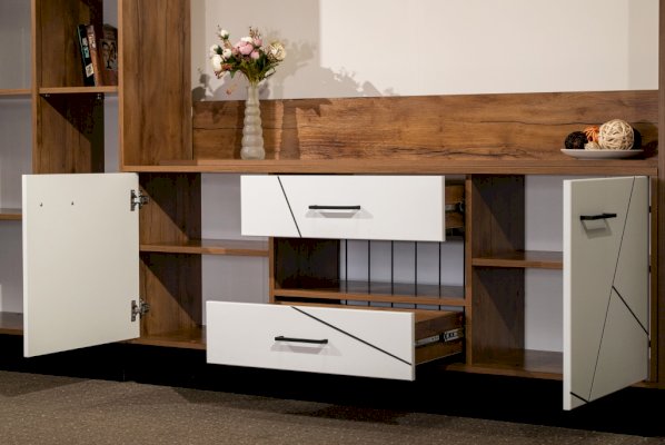 Интрига лежит в основе дизайна данного модуля. При первом взгляде кажется, что сверху находятся три выдвижных ящика и еще один - внизу, в центре. На самом деле выдвижных ящиков два – по центру – сверху и снизу. Ящики снабжены шариковыми направляющими, которые обеспечивают плавный ход выдвижения. Справа и слева расположены два отсека с распашными дверцами, за которыми скрываются по две полки из ЛДСП. Украшение и изюминка модуля – центральная открытая полка. Она как будто улыбается владельцу – открыто, приветливо и дружелюбно.