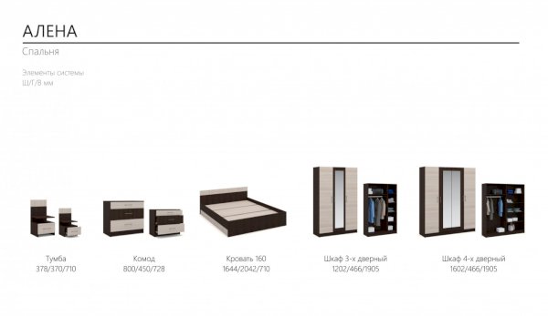 Спальня Алена выполнена в стиле минимализм - естественные цвета, текстура дерева, простота и функциональность. В комплекте Алена оптимальный набор функциональных модулей, который необходим для обустройства спальни: вместительный шкаф с полками и штангой, комод с ящиками, кровать с крепким и надежным основанием из ламинированной плиты и прикроватные тумбы. Кровать с двух сторон идеально дополняют идентичные по стилю прикроватные тумбы с высокой стенкой на одном уровне с изголовьем кровати - это создает визуальную целостность, добавляет ощущение защищенности.