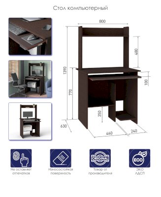 Компактный, эргономичный, адекватная цена, хорошо упакованы комплектующие, крепежных деталей ровно столько, сколько нужно. На дсп ни сколов, ни царапин. Легко собирается по схеме сборки.