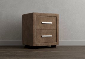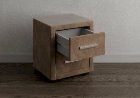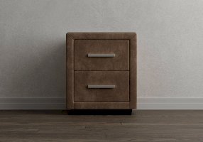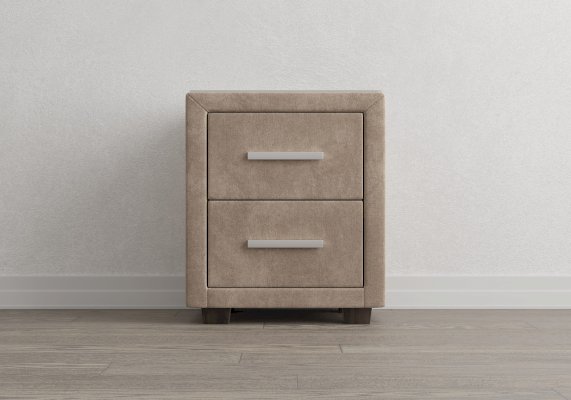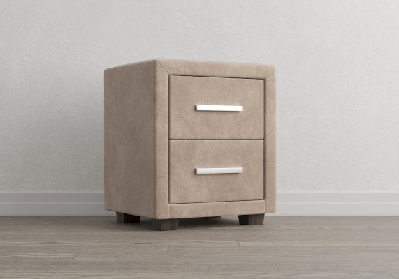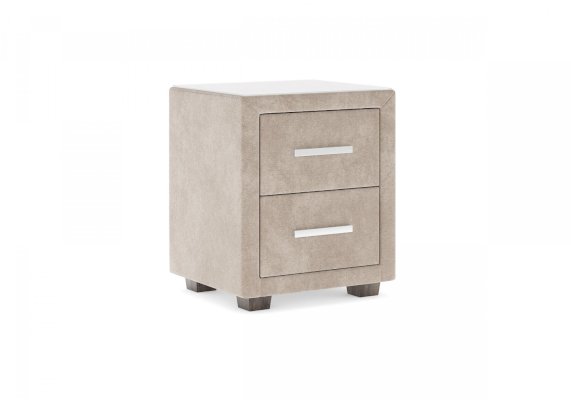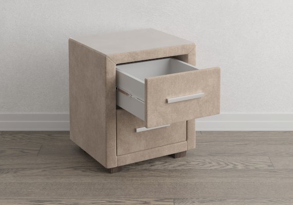 Прикроватная тумба с двумя выдвижными ящиками сочетается с любыми моделями кроватей, органично вписывается в интерьер практически любого стиля. Каркас тумбы выполнен из ДСП. Каркас тумбы и фасад ящиков покрыты обивочным материалом. Для удобства использования и продления срока эксплуатации, рекомендуется использовать стеклянную накладку. Накладка используется в качестве столешницы для тумбы и защищает ее от повреждений и загрязнений.