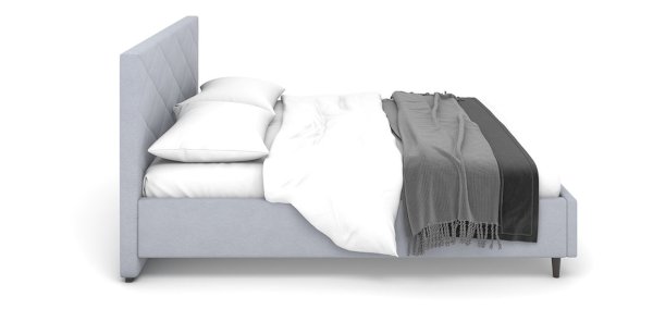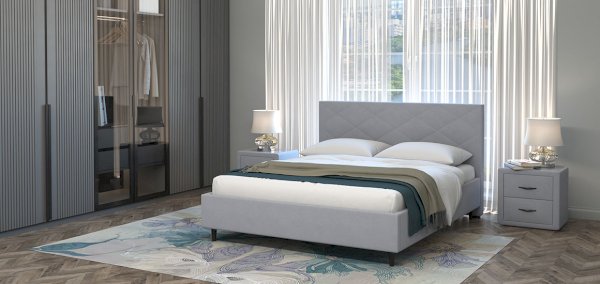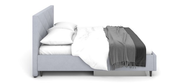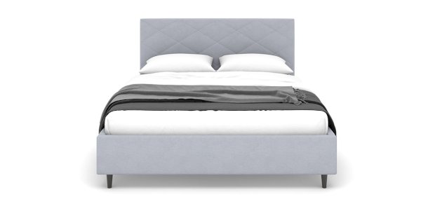 Кровать Аликанте сканди украсит любой интерьер. Особенности кровати: высокое и мягкое изголовье стильной стёжкой, небольшие размеры по ширине относительно спального места и высокие ножки 12 см (пластик).