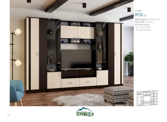 Для удобного хранения большого количества личных вещей идеально подходит гостиная «Муза». Она состоит из вместительных шкафов, полок, ящиков, ниш. Качественна сборка, высококлассные материалы и надежная фурнитура обеспечивают удобство эксплуатации мебели, а также длительный срок ее службы. Элегантный современный дизайн — одно из важнейших достоинств модели.