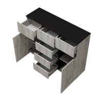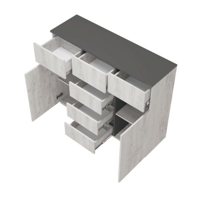 Комод «Мрия» состоит из 2 боковых зон с полками и 6 ящиков, в которых удобно хранить постельное бельё и мелочи.