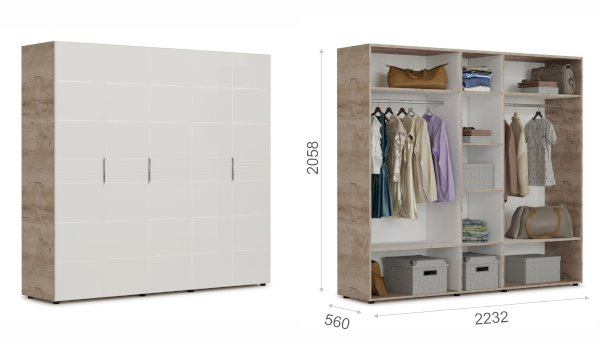 Современный распашной шкаф Джулия яркий представитель европейского минимализма. Это шкаф-конструктор, который позволяет выбрать подходящий вам размер, его наполнение и дизайн. На базе корпуса можно создать множество комбинаций: с зеркалами, с глухими глянцевыми фасадами, с порталом из ЛДСП 22мм или без него. Дополнительная опция – светодиодная подсветка монтируется в верхней части портала над каждой дверью. Шкаф выполнен из экологически безопасных надежных материалов. Декором белым глянцевым фасадам High Gloss служит фрезерованный рисунок «Волна» - подчеркивает зеркальный блеск, делает интерьер спальни особенным и неповторимым. Торцевые ручки из хромированного металла - яркий акцент фасадов. Наполнение шкафа включает в себя вместительные полки и отделения со штангой, что позволяет создать систему для хранения вещей различного назначения. Идеально компонуются со всеми модулями системы Джулия.