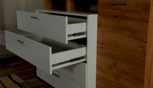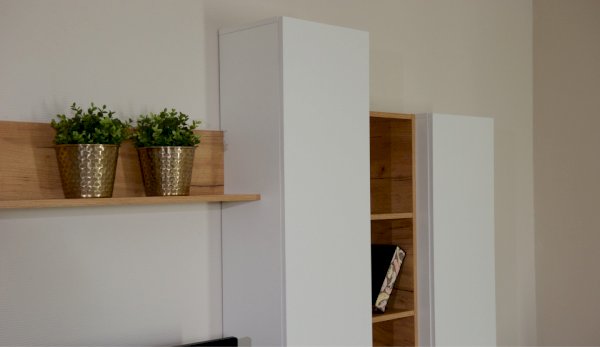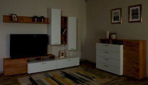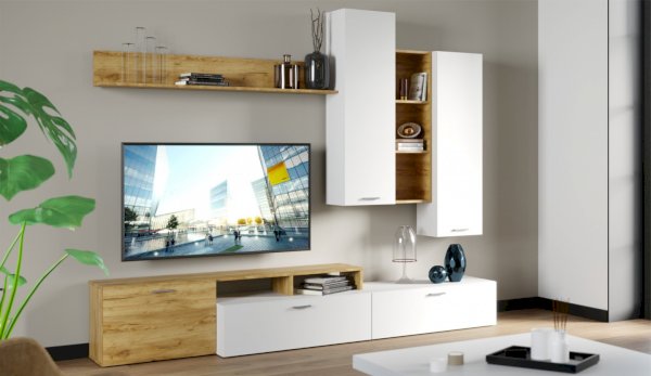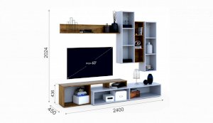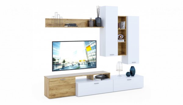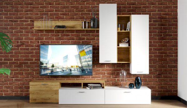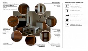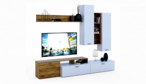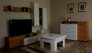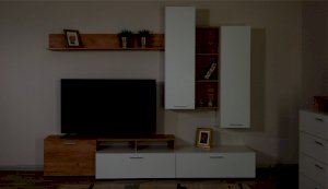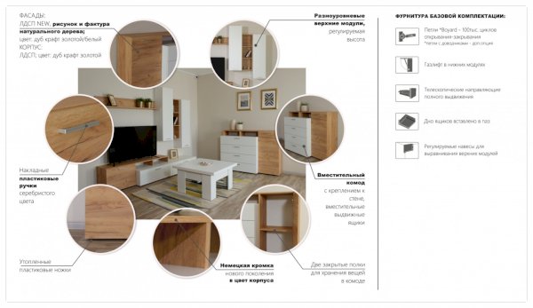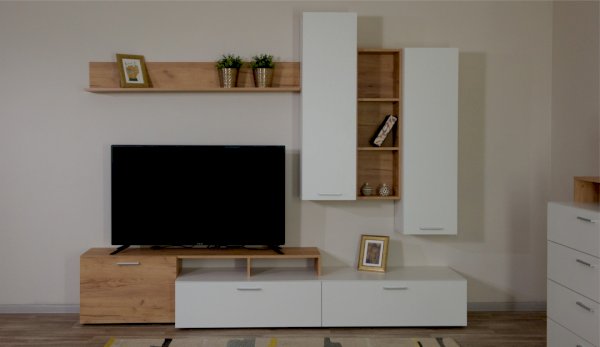 Стенка выполнена с учетом новейших дизайнерских решений - сочетание теплого оттенка дерева с четкой древесной текстурой и белого цвета, разноуровневые модули, скрытая крепежная фурнитура. Все эти элементы создают визуальную легкость и компактность стенки. Мебель легко устанавливается и регулируется по высоте. Широкая тумба для ТВ позволит разместить телевизор любой диагонали, полки послужат для размещения других медиа устройств. Стенку дополняет вместительный комод с ящиками полного выдвижения. Мебель выполнена из высококачественных экологичных материалов.