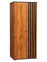 Дверцы шкафа разной ширины. Однотонное полотно гораздо шире, дверца с фасадной рейкой уже – она является основным акцентом и сразу обращает на себя внимание.