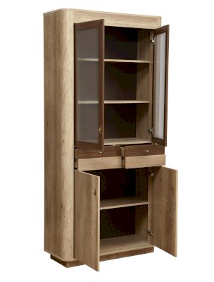 Комбинированный шкаф не зря получил такое название. Он сочетает в себе и витрину, и комод, и тумбу! Модуль разделен на несколько частей, у каждой из которых – свои задачи. Верхняя часть шкафа представляет собой витрину: две распашные стеклянные дверцы заключены в изящную рамочную конструкцию, открываются навстречу друг другу, а внутри – три широкие и глубокие полки из ЛДСП, каждая из которых выдерживает вес до 5 кг. Можно поставить фамильный сервиз или книги. Под отсеком-витриной находятся два выдвижных ящика. Они предназначены для документов и других бумаг. Под ними тоже находятся две полки с распашными дверцами, но в отличие от верхней части – эти дверцы с закрытыми фасадами.