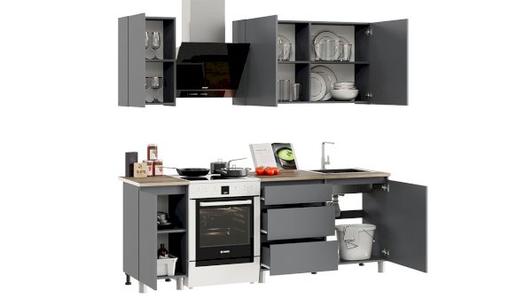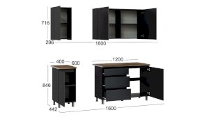 Сборка: нижнего корпуса шириной 1200 мм ящики всегда слева, верхних корпусов и стола 400 мм - универсальная