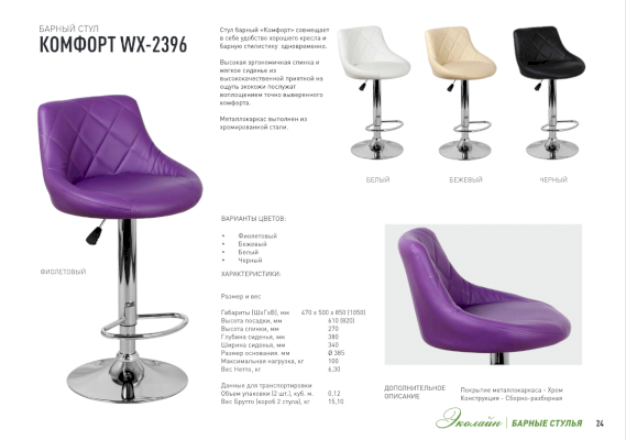Популярный барный стул КОМФОРТ WX-2396 со спинкой непременно придется вам по вкусу и создаст в кафе неповторимую атмосферу. Основа барного стула КОМФОРТ WX-2396 - мощная стальная хромированная опора, которая крепится к надежному основанию в форме плоского диска и гарантирует требуемый уровень устойчивости. Мягкие формы сидения и спинки с прошивкой ромб обеспечат посетителю комфорт.