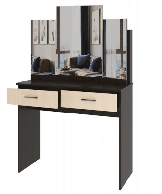 Столик туалетный с 2-мя ящиками на роликовых направляющих с задней надстройкой. Боковые зеркала поворотные, на карточной петле.