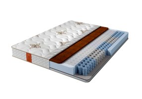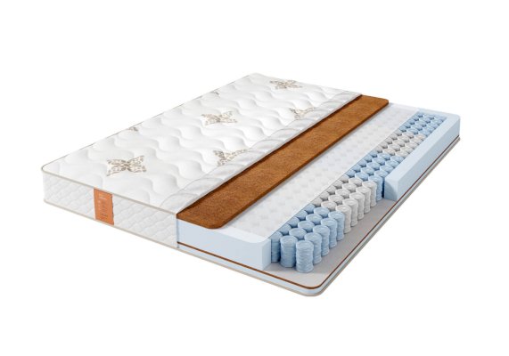 В основе матраса блок независимых пружин Pocket 5 Zone, имеющий 5 зон различной степени упругости, плотностью 512 пружин на спальное место. Благодаря использованию проволоки различного диаметра каждая из зон обеспечивает правильную поддержку позвоночника и правильное распределение нагрузки. Матрас Eco optima с разной жесткостью сторон. С одной стороны, кокосовая койра в комбинации высокоэластичной пеной Foam, обеспечивают среднюю жесткость. Двойной слой кокосовой койры, с другой стороны, придает максимальную жесткость матрасу. Чехол выполнен из приятного турецкого трикотажа, с вискозой в составе, простеганного на объемном гипоаллергенном синтепоне.