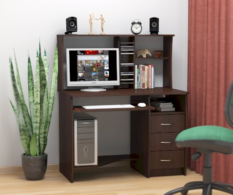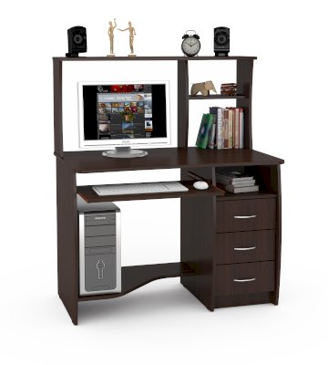 Это удобный компьютерный стол с большим количеством полок для хранения ваших вещей. Лаконичный дизайн, строгость и простота форм модели будут уместны как в офисной, так и в домашней обстановке.Изделие оснащено тремя глубокими выдвигающимися ящиками, над которыми расположена открытая ниша для хранения канцелярских принадлежностей, папок и других вещей. Так же, стол оборудован полкой для клавиатуры, которую можно легко убрать, если вы планируете работать за ноутбуком. Стол прослужит вам долгое время, ведь он изготовлен ЛДСП, а для этого материала характерны долговечность и прочность.