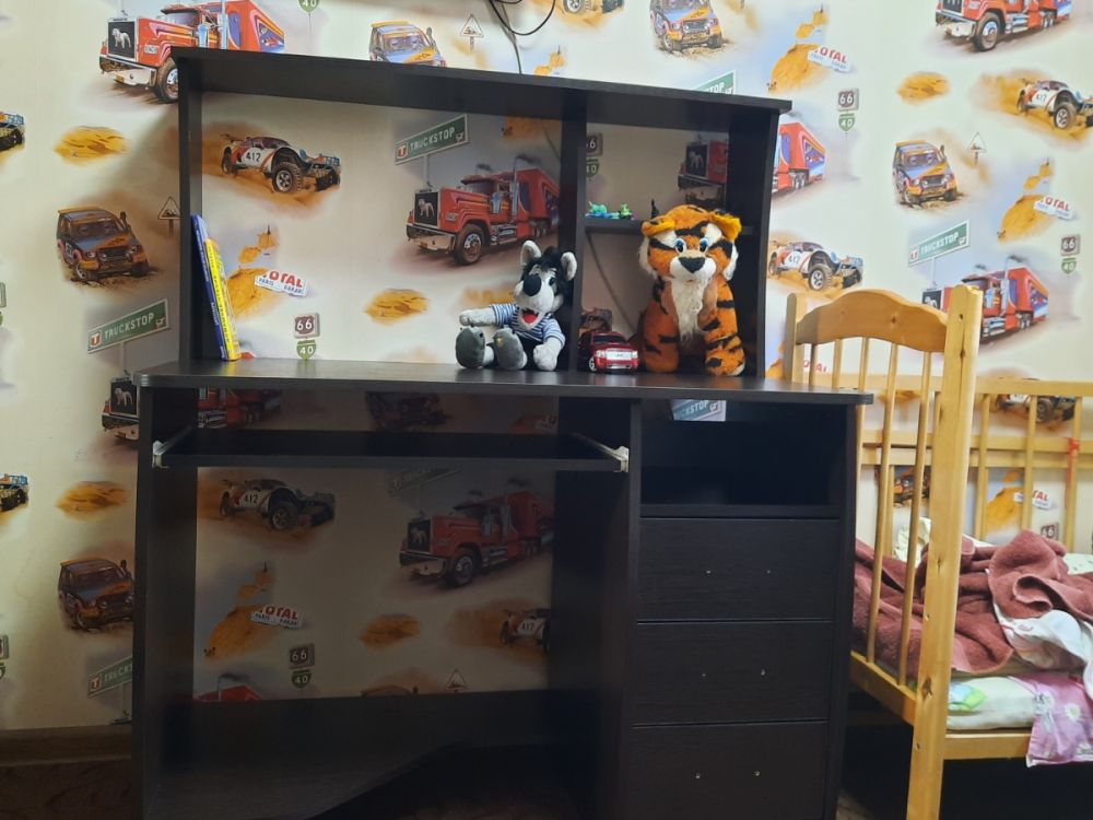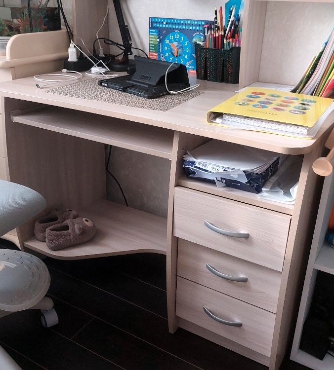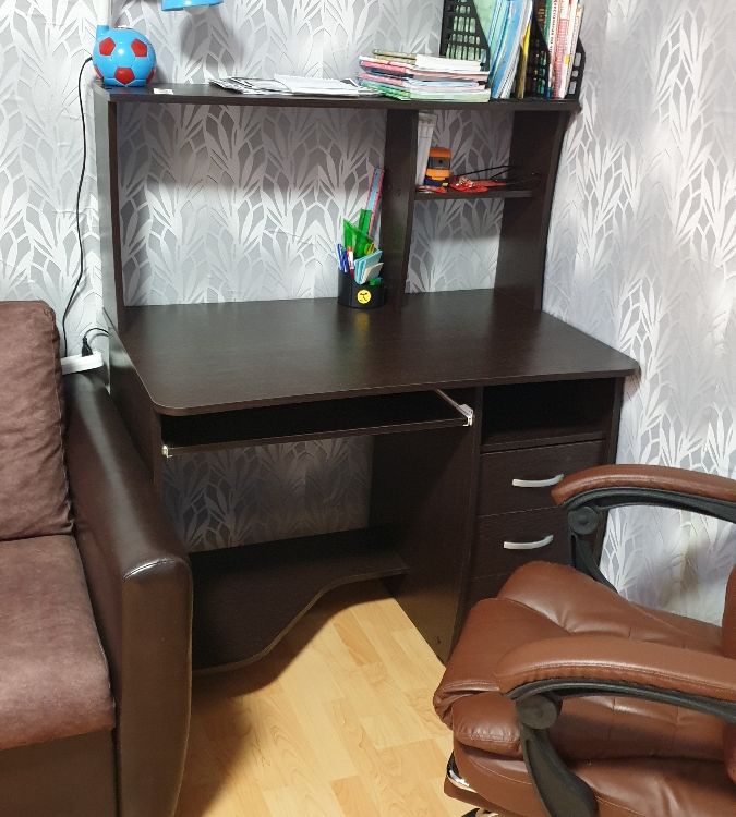 пришёл конечно с небольшой задержкой в два дня, но это не страшно. Курьеры общительные сами выгрузили, сами занесли спасибо им большое. Стол пришёл без сколов идеально упакован, качество отличное, все дырки совпадают, собрали быстро вдвоём с сыном, инструкция понятная. Ручки на ящики пока не ставили чтобы младшая дочь туда не лазила. Сыну стол очень понравился место много не занимает