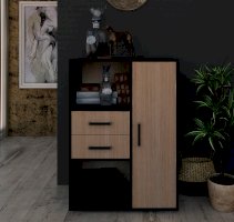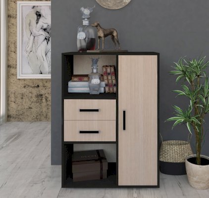 Стандартная комплектация – слева открытые полки. Справа – шкафчик, закрытый створкой.