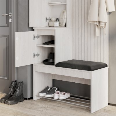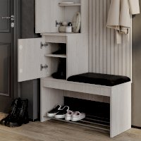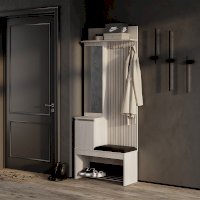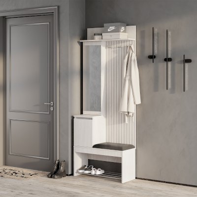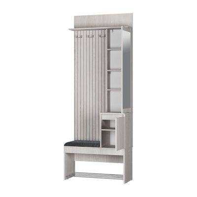 Функционал прихожей «Лама» продуман до мелочей. В данной модели предусмотрены все необходимые зоны. Удобные крючки позволяют разместить повседневную одежду, не занимая при этом лишнего пространства. Горизонтальная зона из металлических труб предназначена для хранения обуви.