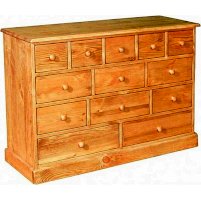 Широкий комод-тумба с множеством ящиков различного размера. Этот комод будет удобен и для мелочей в спальне, и для кухонных принадлежностей. Небольшая высота делает его возможной заменой телевизионной тумбе. Донышки ящиков набраны из сосновых дощечек. В конструкции нет элементов из ДСП или фанеры.