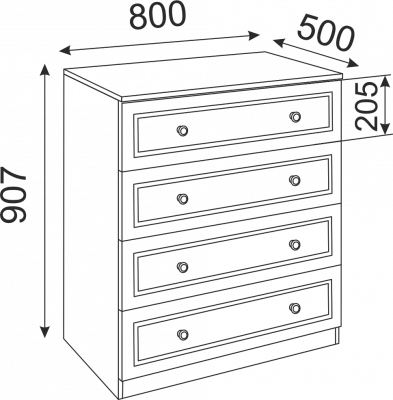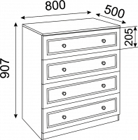 Особенности: Комод имеет 4 выдвижных ящика без разделителей.
