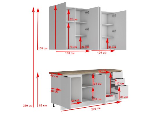 Высота нижних модулей (с учетом столешницы): 860 мм