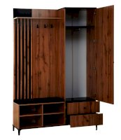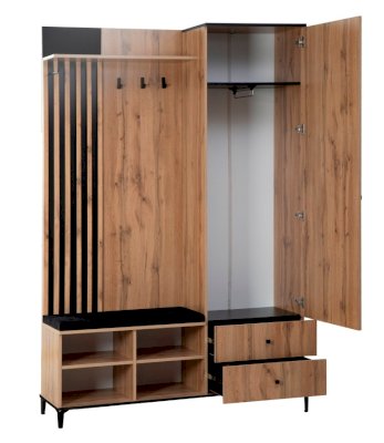 В шкафу есть открытая секция с тремя металлическими крючками, чтобы повесить верхнюю одежду. Ниже предусмотрен мягкий элемент, чтобы можно было присесть и снять обувь или просто поставить сумку. В закрытой секции - выдвижная штанга и шляпная полка. Выдвижная штанга выдерживает вес до 16 кг. Снизу предусмотрены два вместительных выдвижных ящика с шариковыми направляющими. Ящики можно использовать для хранения обуви и обувных аксессуаров.