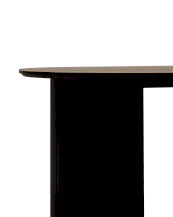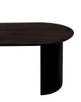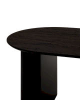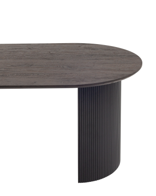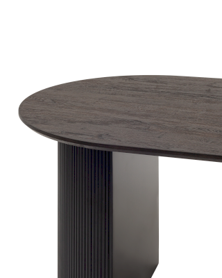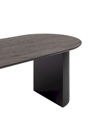 Столешница выполнена из прочного и долговечного МДФ. Темная поверхность столешницы гармонично сочетается с массивными ножками черного цвета. Простая овальная форма стола позволит легко вписать его в современный интерьер, стол украсит кухню, гостиную или современное кафе, ресторан. Опорные плиссированные ножки в лаконичном дизайне надёжно удерживают всю конструкцию и дополняют монолитный образ.