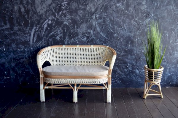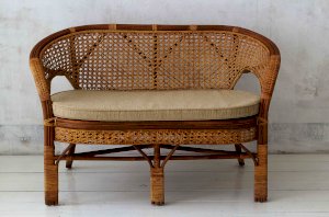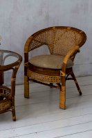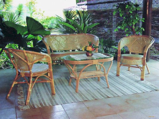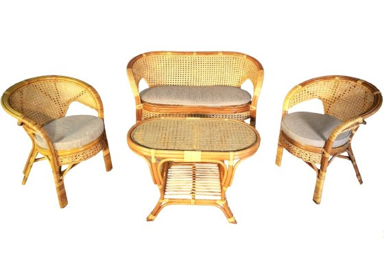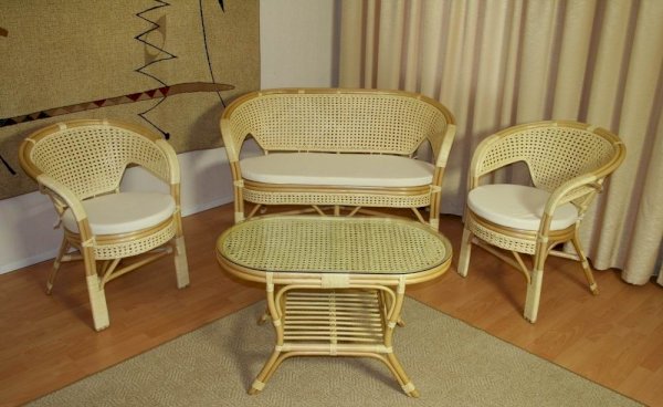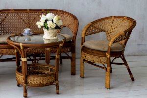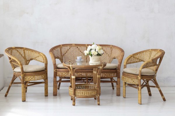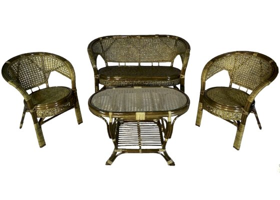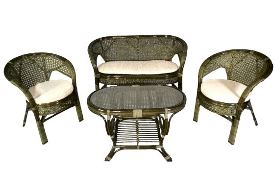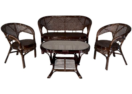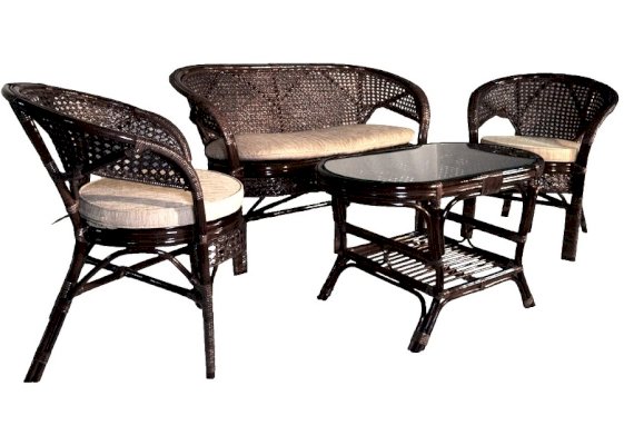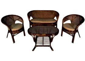 Комплект мебели для террасы 02/15 включает в себя: 2 кресла, плетеный двухместный диван, столик журнальный, подушки из материала улучшенного качества.