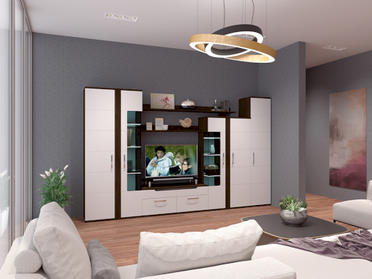 Стенка «Барселона» выполнена в стильном современном дизайне, прекрасно сочетающем в себе контрастность цвета, ассиметричное исполнение, стеклянные витринные модули и элементы подсветки. Фасады МДФ