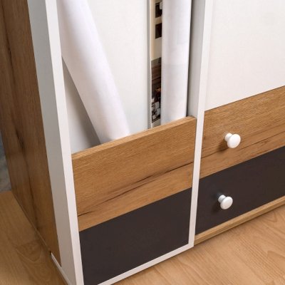 Нередко хобби ребенка перерастает в нечто большее и становится не только способом реализовать свои творческие способности, но и делом всей жизни. Уникальный выдвижной шкаф для хобби ЛОЙС 85 с двумя зонами хранения: внутренняя закрытая зона и фасадная часть с карманами. Внутри шкафа полки с ограничителями и ниша с крючками, где можно хранить форму для тренировок, мячи, ролики, наборы для творчества и другие аксессуары для хобби. Зона хранения на самом фасаде включает в себя: карман для высоких бумаг и ватманов, ручку, выполненную виде полочки, и два крючка, на которые удобно повесить заработанные медали, скакалки, элементы декора. Выдвижная система ЛОЙС 85 на роликах оснащена широкими шариковыми направляющими полного выдвижения. С ЛОЙС 85 в комнате появится место для хранения вещей тесно связанных с увлечениями детей. Модуль обязательно крепить к стене!