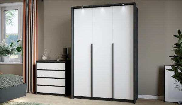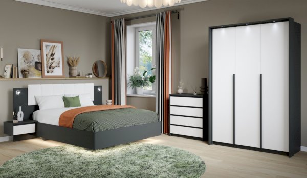 Мишель – это современная спальня с лаконичными формами и строгой геометрией в актуальных природных цветах. Оригинальная конструкция основания в сочетании со светодиодной подсветкой создают «эффект парения». Накладные светильники в комбинированном изголовье дают дополнительное освещение в ночное время, а мягкая накладка с вертикальной отстрочкой поддержит спину во время отдыха. Отсутствие лицевой фурнитуры в ящиках и комодах подчеркивают минималистичный дизайн спальни, а контрастные ручки шкафов оттеняют белизну фасадов.