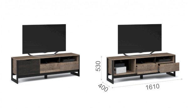 Функциональная тумба для TV и аудио аппаратуры оснащена двумя ящиками на телескопических направляющих, закрытыми и открытыми полками для хранения сопутствующих аксессуаров. Отсутствие лицевой фурнитуры подчеркивает минимализм и геометрию модуля. Особенность дизайна – это сочетание реалистичных по цвету и тактильности трендовых декоров, которые соответствуют последним городским тенденциям. «Дуб Гранж» привлекает имитацией вручную обработанного дерева и выразительной зернистой текстурой, характерной формой досок. Стильный серый цвет «Железного камня» с металлическими разводами и новая текстура состаренной штукатурки в сочетании с гладкостью металла вносят индустриальныи? колорит. Оригинальные ножки-опоры из МДФ контрастного цвета придают изюминку интерьеру.