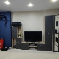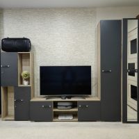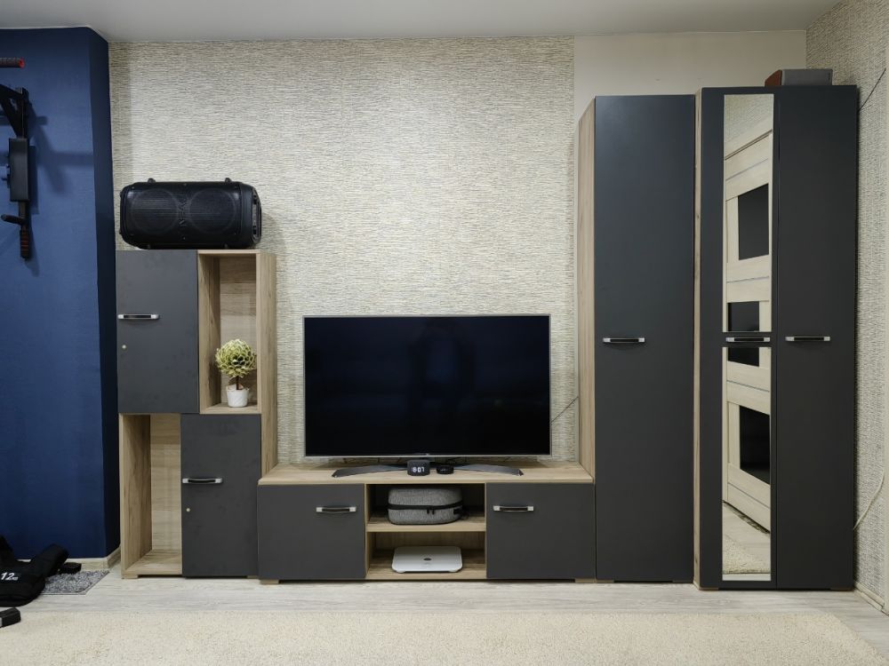 хорошая, вместимая гостиная, хорошо смотрится в современном интерьере в тёмном цвете. Удобно, что есть закрытые полки и шкаф, куда можно повесить одежду