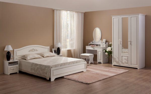 Спальный гарнитур выполнен в цвете белый/джелато софт, который располагает к спокойствию и уюту.