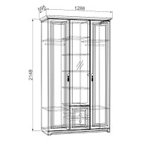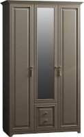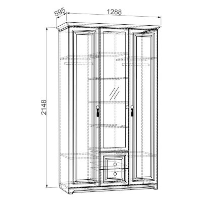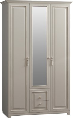 Шкаф 3-створчатый: Корпус – ЛДСП 16 мм Фасады – МДФ с пленкой ПВХ и патиной Кромка – ПВХ 0,4 мм Зеркало – 4 мм Направляющие – шариковые Ручки – фарфоровые Опоры – пятниковые Декор – кисти для штор