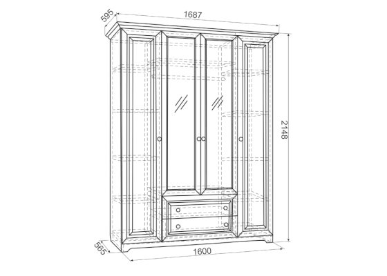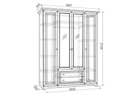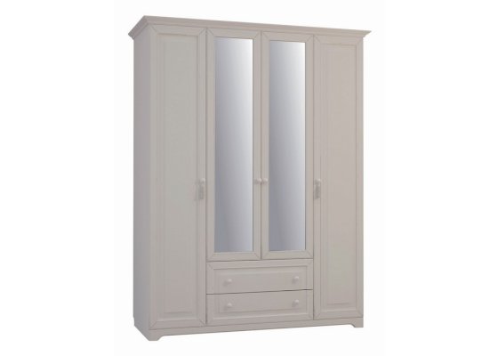 Шкаф 4-створчатый: Корпус – ЛДСП 16 мм Фасады – МДФ с пленкой ПВХ и патиной Кромка – ПВХ 0,4 мм Зеркало – 4 мм Направляющие – шариковые Ручки – фарфоровые Опоры – пятниковые Декор – кисти для штор