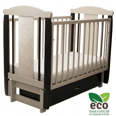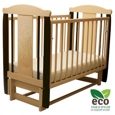 Кроватка декорирована фрезерным рисунком "Бабочка". Уникальные фрезерные рисунки размером от 50 см на обеих спинках.