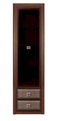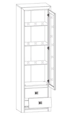 Шкаф имеет одно вертикальное отделение с тремя вкладными стеклянными полками и отделением с двумя выдвижными ящиками.