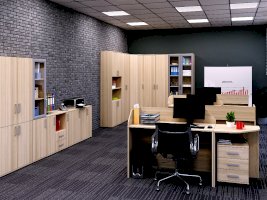 Закрытый шкаф для документов. За дверцами расположены вместительные полки. Стеклянная дверца, придает конструкции визуальную легкость.